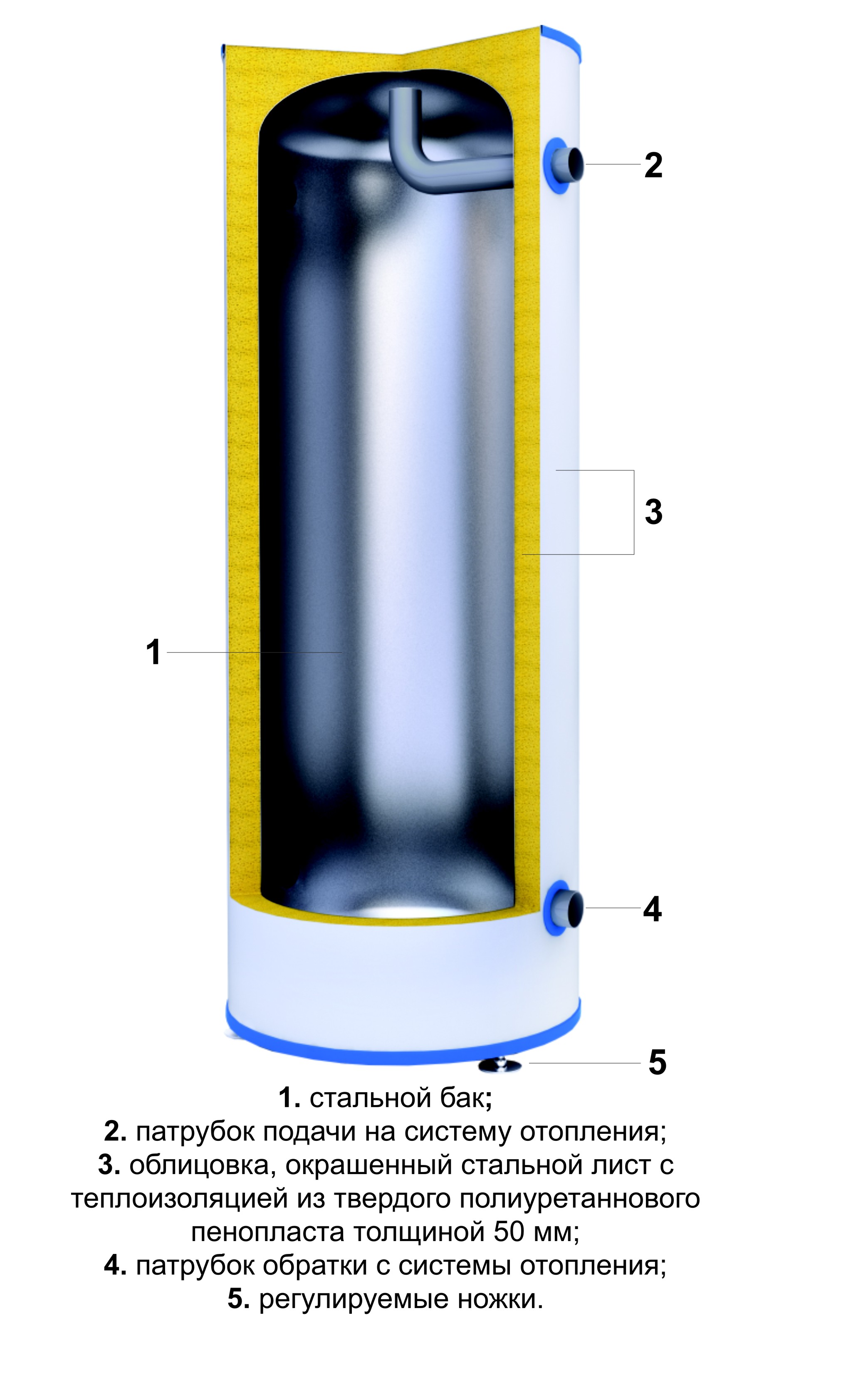 Теплоаккумулятор представляет собой хорошо теплоизолированный металлический бак цилиндрической формы (бак-аккумулятор по принципу – термос), который способен накапливать тепловую энергию и удерживать ее в течение длительного времени. Он устанавливается на выходе котла и расходует рабочую жидкость, нагреваемую в котле, по мере необходимости. В зависимости от объема теплоаккумулятора, тепловых потерь здания, погодных условий и заданной температуры, такое устройство может обеспечивать комфортную температуру в доме от нескольких часов до нескольких дней.
